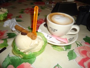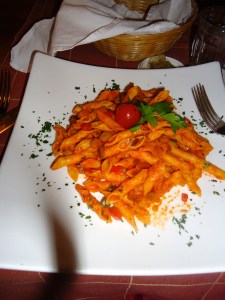 Eventually we stopped in a café for coffee & gelato and found some non-Italian English speakers who gave us recommendations for where to eat. We found a delicious-looking restaurant that unfortunately did not open until 6pm. The problem was that we needed to return to the train station at 6:45pm. At 5:45pm we perused the menus and at 6 on the dot, we placed our orders. At this point, I’m positive the owner of the establishment thought we were very strange (even for Americans). While we waited for the main dishes, we enjoyed fresh bread and small meat salads that were “gifts from the kitchen”. Before any of us had finished our course, we asked for the bill and ordered dessert “to go”. If you’ve ever traveled in Europe, you can only imagine the strange looks we received on making our requests.
